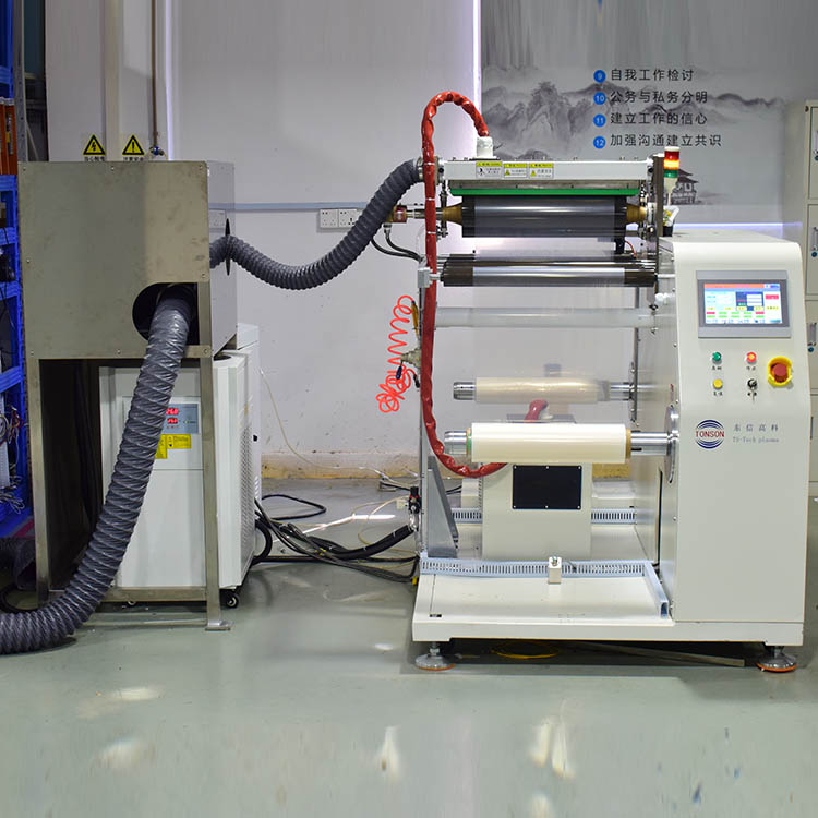 将高壓高頻電流施加于水平放置的放電電極上,在電極之間産生細小密集的藍紫色火花使空氣電離,這些空氣電離産生的等離子體在強電場的作用下加速并沖擊被處理PET的聚合物表面,而等離子體粒子的能量可以誘導化學鍵斷裂和聚合物表面的分子降解,在表面分子鏈上形成羰基和含氮的極性基團,使被材料的表面張力明顯增加,而材料表面因強離子沖擊而粗化;協同效應使被處理材料的粘附性明顯改善,同時實現對PET材料進行等離子表面活化和處理,提高PET的表面能和浸潤能力、粘貼性。